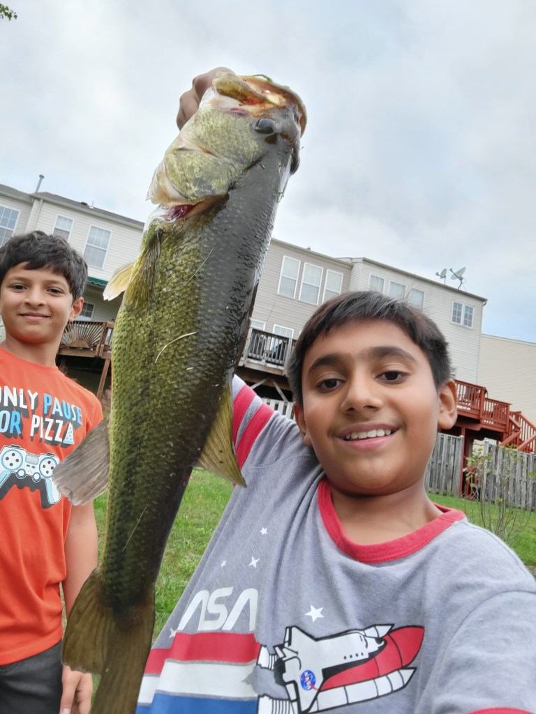 The week before I bought 2 new lures and a pack of small hooks. I bought a white spinnerbait and a Rooster tail with a golden spoon, orange body and a green tail. Although I did not use the Rooster tail that day. We started of with the spinnerbait in my neighborhood pond and the fish where really wanting it judging by the bites. After about an hour of fishing the spinnerbait in the shallow areas I was getting tired with that pot so while I was moving to the deeper side of the pond and my friend with the net walking on the other side While I was walking I casted right near the fountain, and not 4 seconds in of reeling I felt a tug on the other side of the line and there I was as my rod was slipping out of my hands as the fishing was pulling my entire body closer to the water. I quickly put the handle under my armpit from it trying to fly out of my hands. I was yelling for my friend to run towards me. When the fish got closer it finally stopped, I thought it got of the hook. Though when I was reeling in the lure there was something stopping it from moving at all. So I yanked rod with enough power that the fish started swimming away but I finally got it on land with all of my might. As the fish ascended from the water I could not believe what just happened. When I was pulling the Largemouth bass up from its lips I felt the teeth digging into my thumb but that pain did not ruin the moment. After we took pictures and videos we let the fish go.