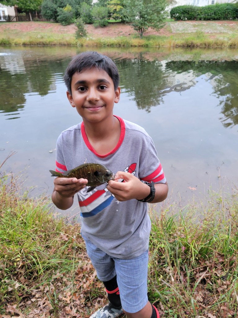 After a couple more tries at that spot we got nothing so we switched to another pond where there were many small minnows that we used as live bait to catch bluegills. So we gathered the minnows and started fishing. We then caught 2 bluegills one big and one small and that was how we ended our day.