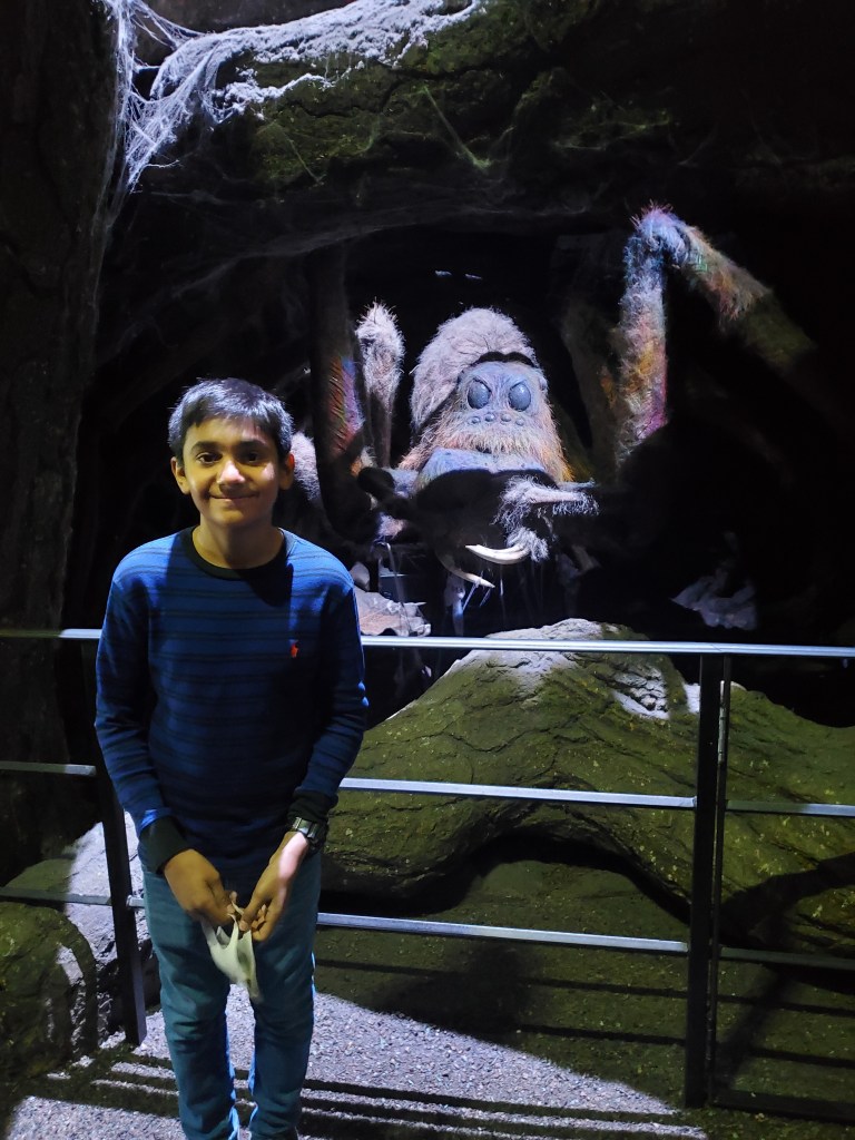 When we walked inside there was music playing from the movies. Next when we opened the door the first thing we saw was a gigantic Ukrainian Ironbelly dragon with its wings open roaring in the air. The dragon had scratches and wounds all over its body. The café behind the dragon was nearest to the tour room line where our journey began. When we entered the walls were full of concept art, scripts, pictures and paintings. The first attraction was Harry’s little room under the stairs. Next they took us to a room and a little theater where they explained what there is to do and what there was to explore. When the video in the theater ended they slid the wall that the screen was on and behind that wall was a massive door for the Great Hall. They had artificial festive food that looked very real on the tables, they had cake, chicken, vegetables, sweets and much more. You could see the grease on the chicken and all the different textures on the foods. When we exited the Great Hall, there was information about everything in the first few stations!